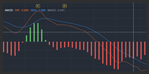 A calculated histogram involving the subtraction of the 26-period moving average from the 12-period moving average to produce indication on price momentum in contrast to the fastest moving 9-period moving average. When they converge into a crossover and diverge away from each other, a trend may follow, providing traders with clues to buy into a potential uptrend or sell into a potential downtrend.